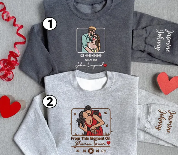 Felpa con cappuccio personalizzata con canzone d'amore ricamata da foto per coppia • Regalo di Natale per coppia
