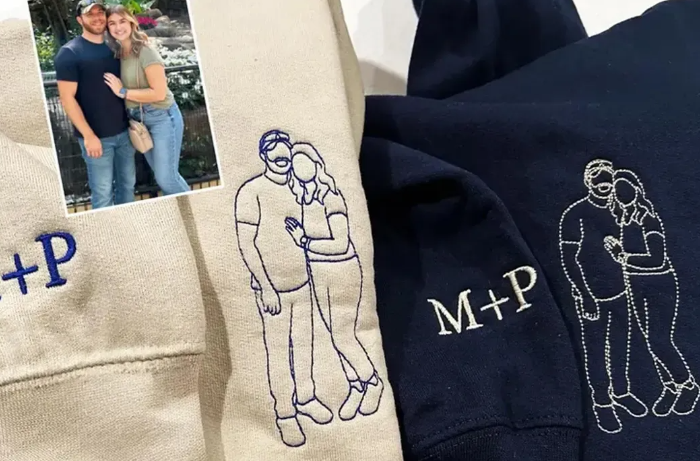 🧵 Contorno fotografico personalizzato per coppia: carica una foto preferita e la trasformeremo in un contorno ricamato dettagliato.
