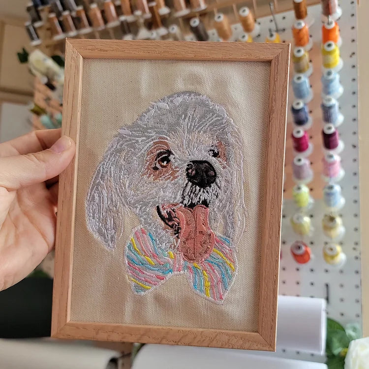 Un ritratto ricamato personalizzato e molto dettagliato del vostro animale domestico.