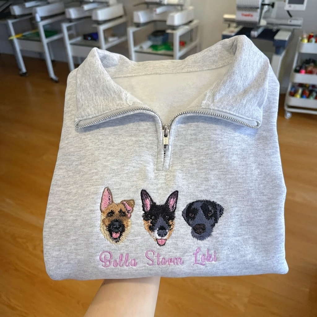 Felpa 1/4 Zip Personalizzata con Ritratto Ricamato del Tuo Animale – Regalo Unico e Commemorativo