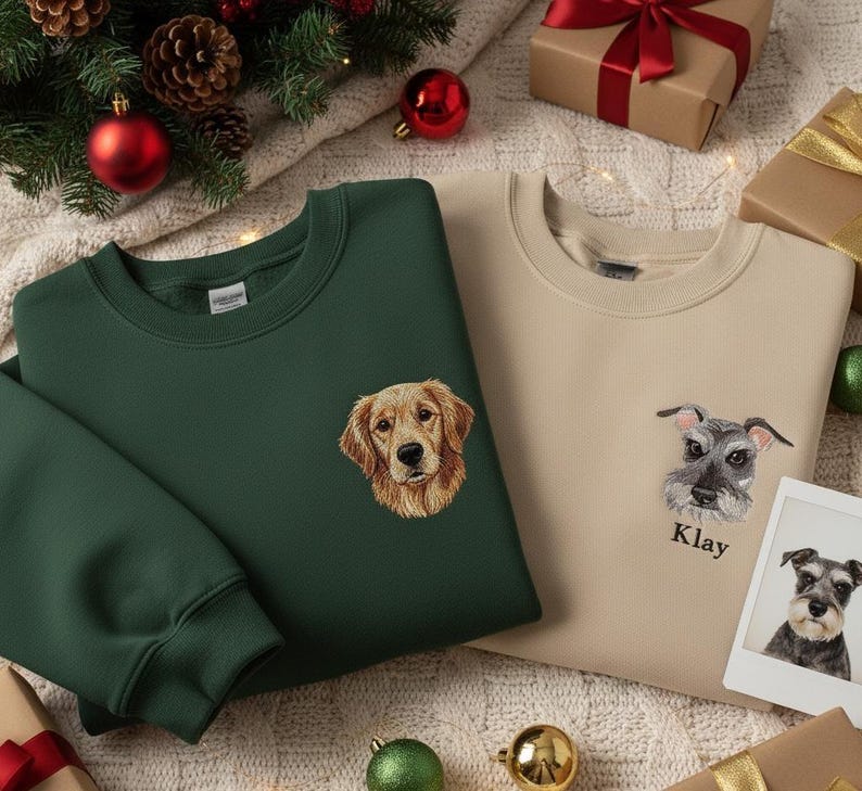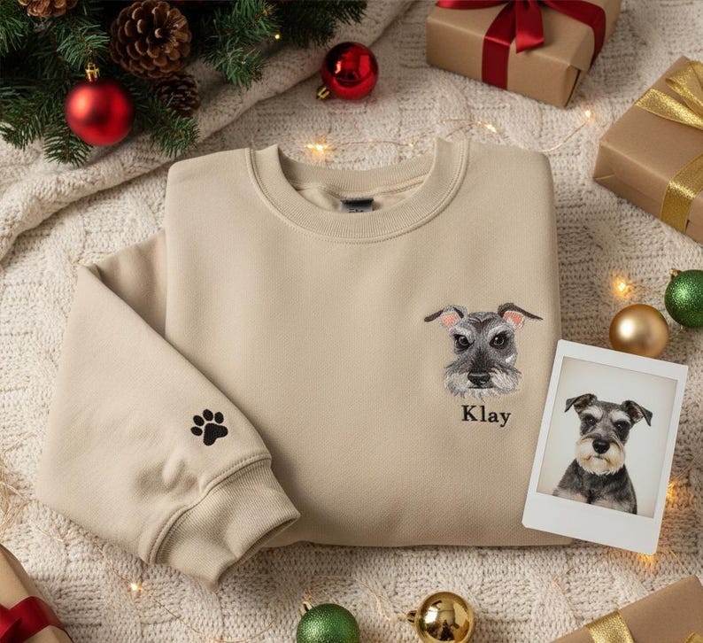 Celebra a tu peludo amigo con una sudadera o camiseta bordada única. Simplemente sube una foto de tu mascota y nuestros artistas expertos la transformarán en un bordado con detalles preciosos de su cara, junto con su nombre para darle un toque personal.