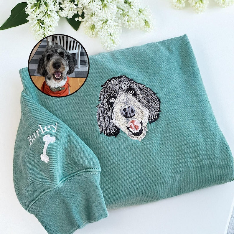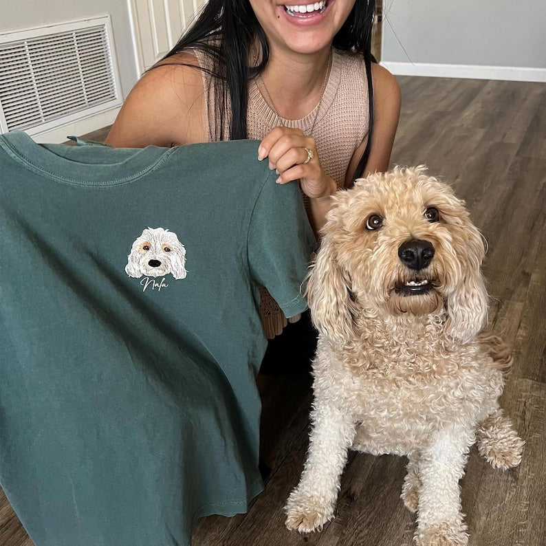 • Retrato personalizado de tu mascota, bellamente bordado en el frente.